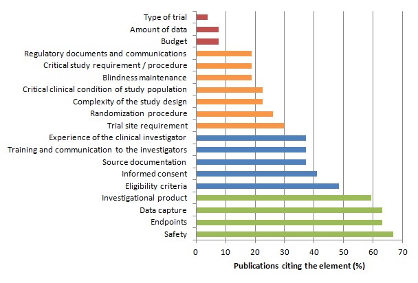 We identified 27 publications (Bakobaki 2011; Baigent 2008; Brosteanu 2009; Journot 2011; Kirwan 2008; Méthot 2012; Sandman 2006; Williams 2006; Bertoye 2006; Cooley 2010; De 2011; Grieve 2012; Kirkwood 2013; Matthews 2011; Ansmann 2013; Venet 2012; Macefield 2012; Tudur-Smith 2014; Graham 2012; Heels-Ansdell 2010; McBee 2012; Novik 2014; Shugarts 2012; CTTI (Morrisson 2010; Morrisson 2011); FDA 2013; EMA; MRC/DH; MRC/DH/MHRA) reporting analyses of monitoring strategies and/or methods for quality control of clinical trial data and procedure. These publications differed significantly in the purpose addressed and the topic discussed. However the identified key elements are reported in the table and figure below.